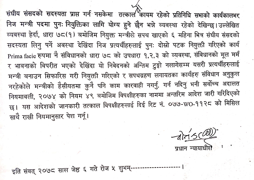 प्रधानन्यायाधीश चोलेन्द्रशम्शेर जबराको एकल इजलासले संसद सदस्य नरहेका मन्त्रीहरु रामबहादुर थापा बादल, टोपबहादुर रायमाझी, लेखराज भट्ट, प्रभु साह, गौरीशंकर चौधरी, मणि थापा र दावा लामालाई मन्त्रीको हैसियतमा कुनै पनि कामकारबाही नगर्नु नगराउनु भनी अन्तरिम आदेश जारी गरेको हो ।