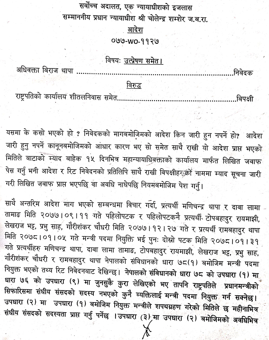 संसद सदस्य नरहेको व्यक्तिलाई दोहोर्याएर मन्त्री बनाउनु संविधान विपरीत हुने भन्दै अधिवक्ता विराज थापा र अधिवक्ता कपिलदेव ढकालले सर्वोच्च अदालतमा रिट दिएका थिए ।
