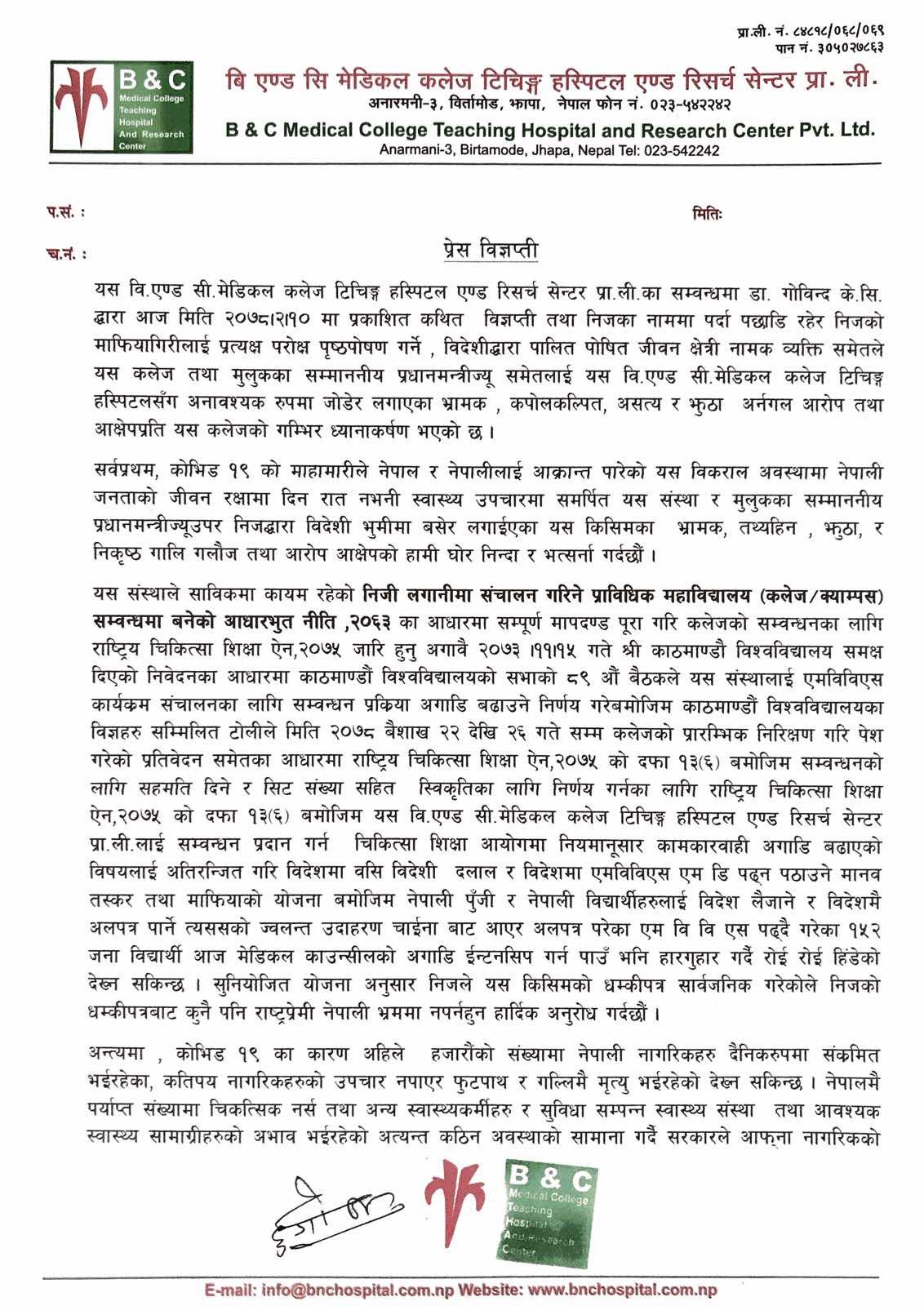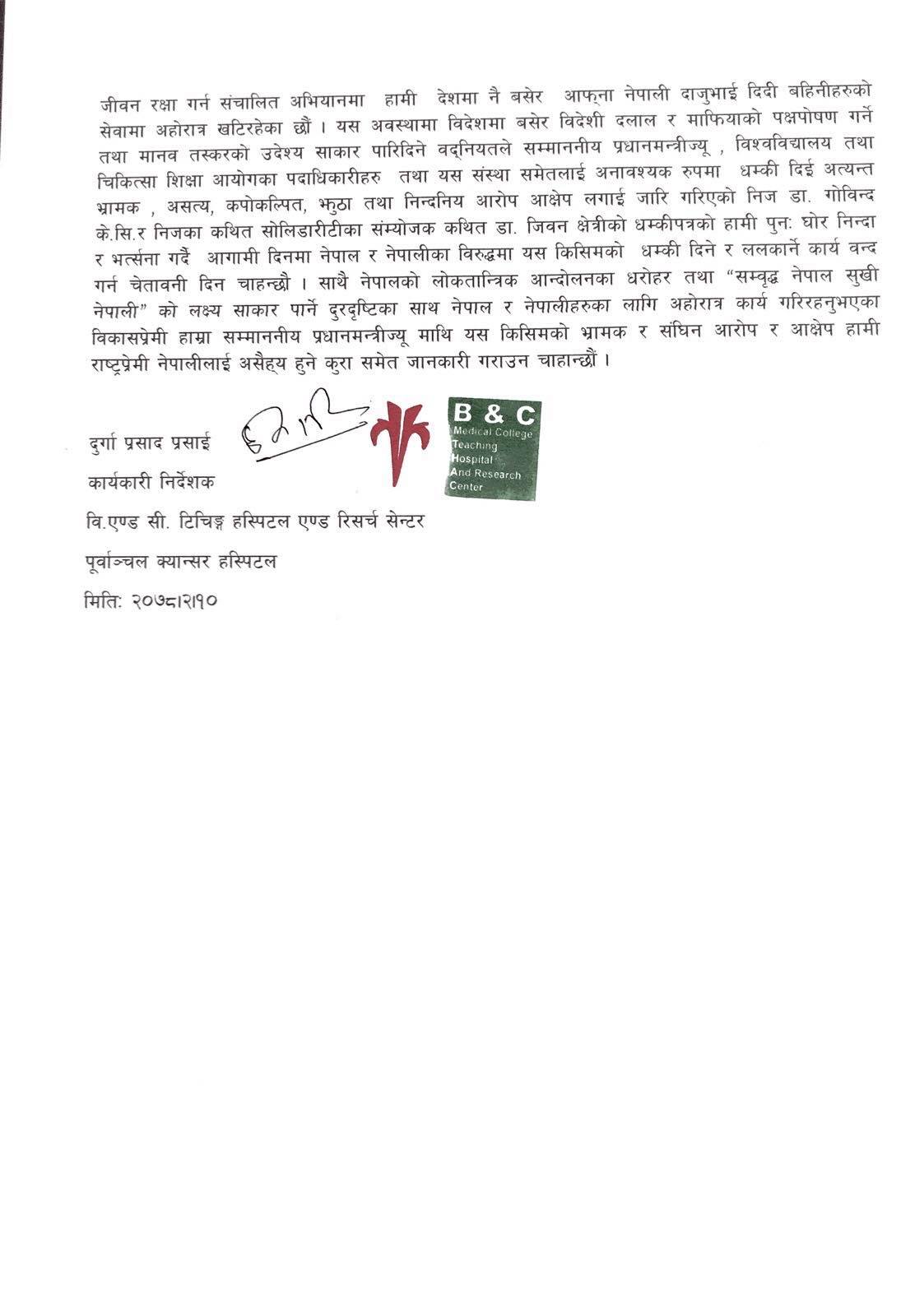 डा. गाेविन्द केसी र जीवन क्षेत्रीकाे विज्ञप्ती भ्रामक र कपाेलकल्पितः विएण्डसी अस्तपाल