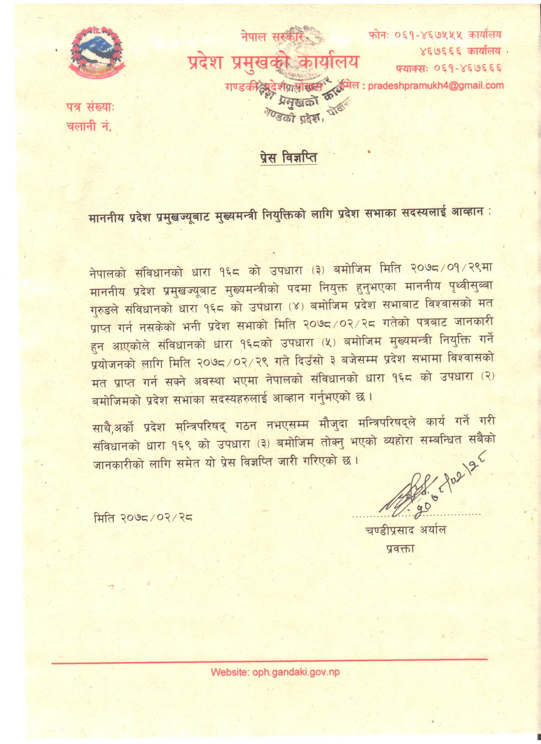 प्रदेश प्रमुखले मुख्यमन्त्री नियुक्तिको प्रयोजनका लागि शनिबार अपराह्न ३ बजेसम्म प्रदेशसभामा विश्वासको मत प्राप्त गर्न सक्ने अवस्था भएमा नेपालको संविधानको धारा १६८ को उपधारा (२) बमोजिम प्रदेशसभाका सदस्यलाई दावी गर्न आह्वान गर्नुभएको हो । जारी विज्ञप्तिमा अर्को प्रदेश मन्त्रिपरिषद् गठन नभएसम्म मौजुदा मन्त्रिपरिषद्ले कार्य गर्ने गरी संविधानको धारा १६९ को उपधारा (३) बमोजिम प्रदेश प्रमुखले तोक्नुभएको जनाइएको छ । साठी प्रदेशसभासद् रहेको गण्डकीमा बिहीबार भएको विश्वासको मत प्रस्तावमा गुरुङले २ र विपक्षमा ३० मत परेका थिए ।