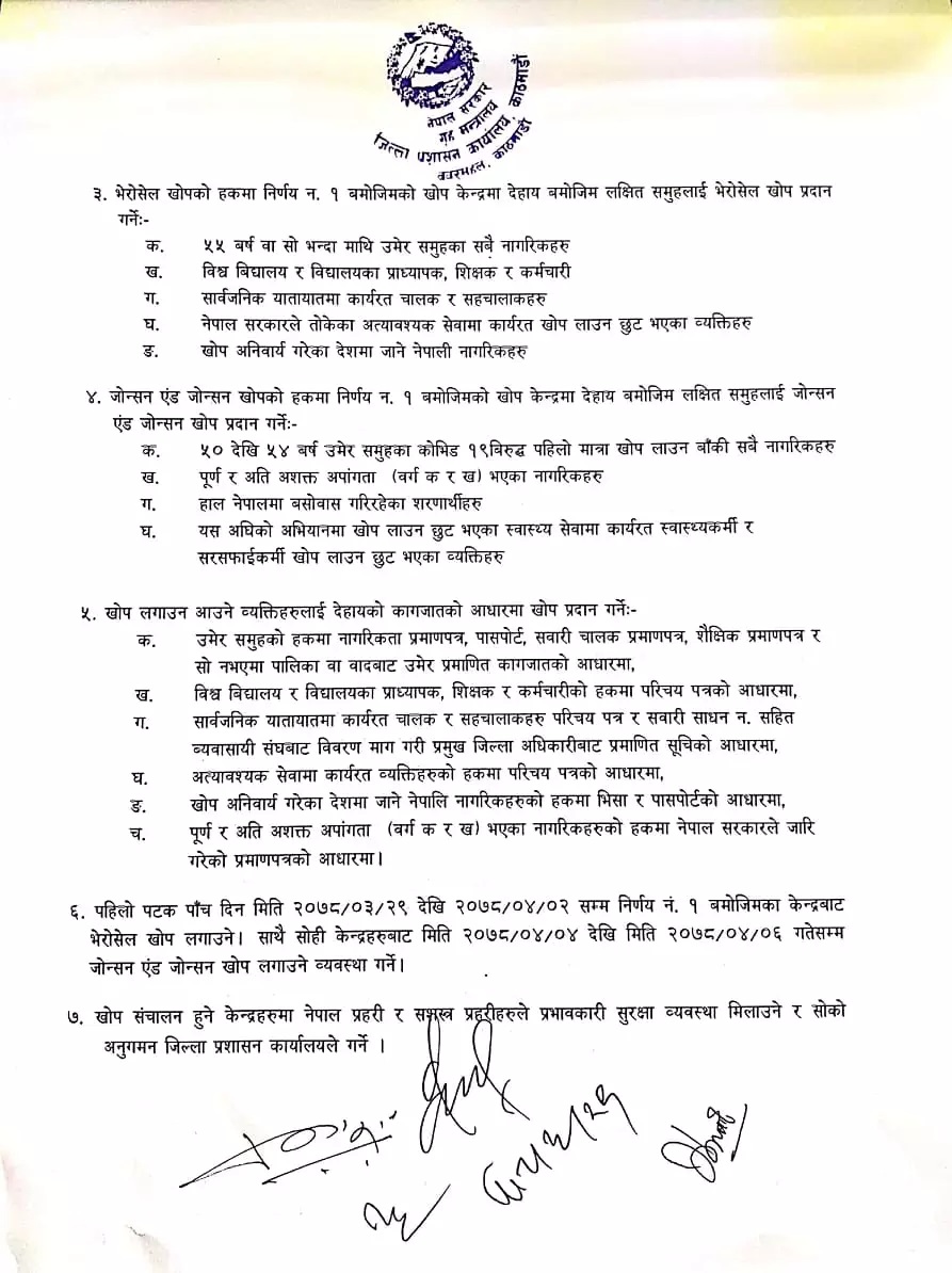 स्वास्थ्य कार्यालय काठमाडौंका प्रमुख बद्रीबहादुर खड्काले स्वास्थ्य मन्त्रालयले निर्णय गरेको प्राथमिकता क्रमअनुसार खोप दिइने बताए । मन्त्रालयले आजदेखि ५५ वर्षमाथिका सबै नागरिक, शिक्षक, प्राध्यापक, कर्मचारी, चालक‚ सहचालक, पहिले लगाउन छुट भएका अत्यावश्यक सेवाका व्यक्ति र खोप अनिवार्य गरेका देशमा जाने नेपाली नागरिकहरुलाई भेरोसेल दिन सुरु गरिएको जनाएको छ।