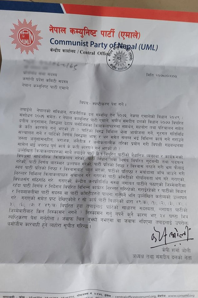 ५ साउनको मिति राखेर पठाइएको पत्रमा फ्लोर क्रस गरेर प्रधानमन्त्री शेरबहादुर देउवालाई विश्वासको मत दिएको बारे केही उल्लेख गरिएको छैन । तर पार्टीविरुद्ध भेला तथा गुटगत गतिविधि गरेको र पार्टी निर्णय विपरीत विपक्षी गठबन्धनमा सामेल भई अपराधपूर्ण काम गरेको आरोप लगाएको छ ।