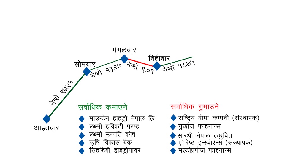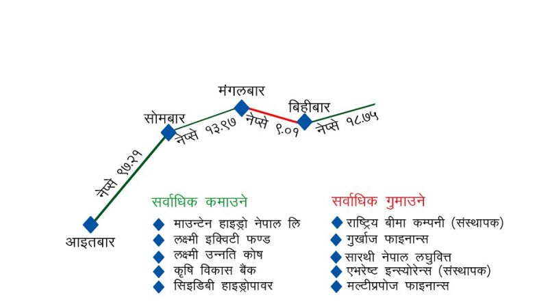 साताभर माउन्टेन हाइड्रो नेपालका लगानीकर्ताले ३०.९२ प्रतिशतले कमाएका थिए । यस्तै, लक्ष्मी इक्विटी फन्ड २७.३९, लक्ष्मी उन्नति कोष २४.२५, कृषि विकास बैंक २७.७६ र सिइडिबी हाइड्रोपावरका लगानीकर्ताले २२.६२ प्रतिशतले कमाए ।  त्यसैगरी राष्ट्रिय बीमा कम्पनीका संस्थापक शेयरधनीले ५.५५ प्रतिशतले गुमाउँदा गुर्खाज फाइनान्स ५.४४, सारथी नेपाल लघुवित्त ४.६६, एभरेष्ट इन्सुरेन्सको संस्थापक शेयर ४.५९ र मल्टीप्रपोज फाइनान्स कम्पनीका लगानीकर्ताले ४.१९ प्रतिशतले गुमाए ।