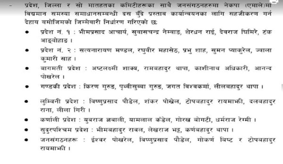 यसैगरी, प्रदेश २ मा सत्यनारायण मण्डल, रघुवीर महासेठ, प्रभु साह, सुमन प्याकुरेल, ज्वालाकुमारी साहलाई जिम्मेवारी दिइएको छ । बागमति प्रदेशमा अष्टलक्ष्मी शाक्य, रामबहादुर थापा, काशीनाथ अधिकारी, आनन्द पोखेललाई १० बुँदे सहमति कार्यान्वयनका लागि सहजीकरण गर्न एमालेले जिम्मेवारी दिएको छ ।