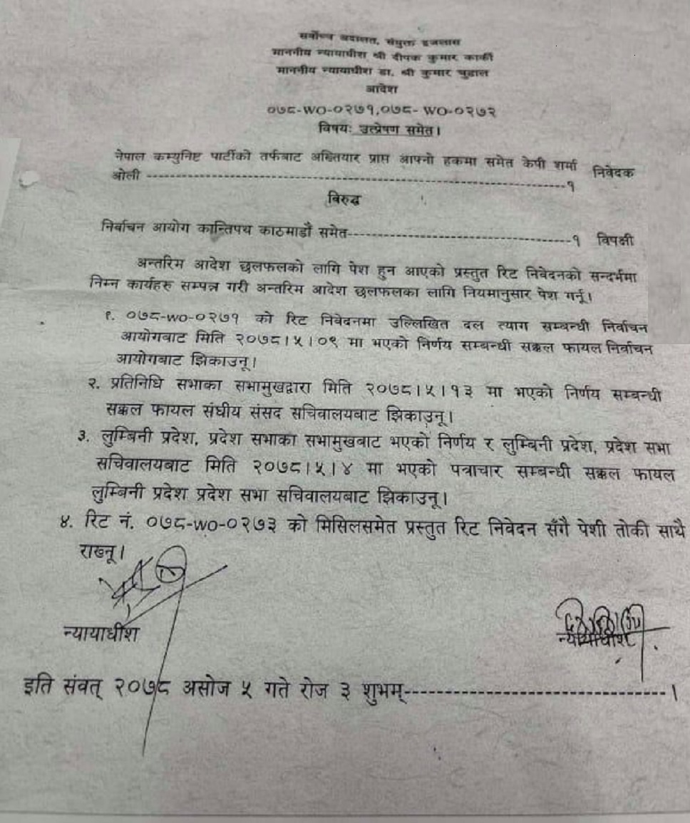 मंगलबार न्यायाधीश दीपककुमार कार्की र डा. कुमार चुडालको इजलासले नेकपा एकीकृत समाजवादी दल दर्ता गर्ने निर्वाचन आयोगको निर्णयको सक्कल निर्णय माग गर्ने आदेश दिएको हो ।