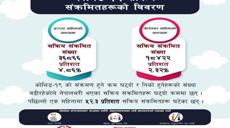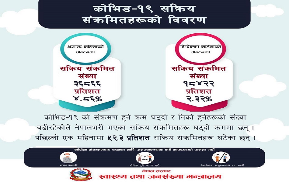 कोरोना भाइरसका सक्रिय सङ्क्रमितमा ५० प्रतिशतभन्दा बढी कमी आएको देखिएको छ । यसअघि सबैभन्दा बढी गत भदौ ३ गते ४० हजार ५०० जना सक्रिय सङ्क्रमित रहेकामा हिजो मङ्गलबारको तथ्याङ्कमा जम्मा १८ हजार ४२२ जना मात्र सक्रिय सङ्क्रमित देखिएका छन् । सक्रिय सङ्क्रमितको यो गिरावट ५० प्रतिशतभन्दा बढी हो ।