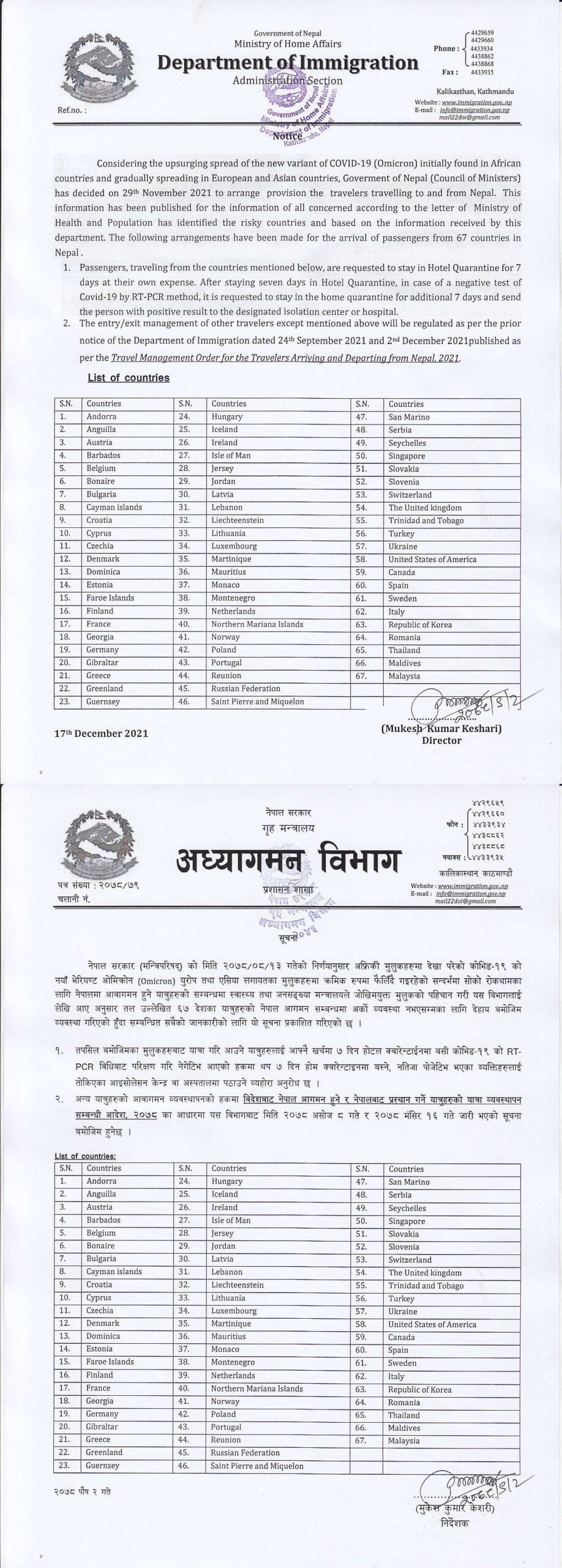 काठमाडौँ, ३ पुस – कोरोना भाइरसको पछिल्लो भेरिएन्ट ओमिक्रोन फैलिन नपाओस् भनेर सरकारले ६७ देशबाट नेपाल आउने यात्रुलाई अनिवार्य ७ दिन होटल क्वारेन्टिनमा बस्नुपर्ने नियम लगाएको छ।