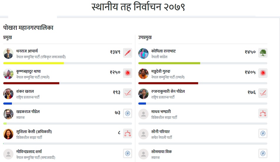 पोखरा महानगरपालिकामा नेपाल कम्युनिष्ट पार्टी (एकिकृत समाजवादी) उम्मेदवार धनराज आचार्य १,३४९ मतका साथ अग्रस्थानमा छन् । आचार्यलाई पछ्याइरहेका नेपाल कम्युनिष्ट पार्टी (एमाले)का कृष्णबहादुर थापाले १,२५० मत ल्याएका छन् ।