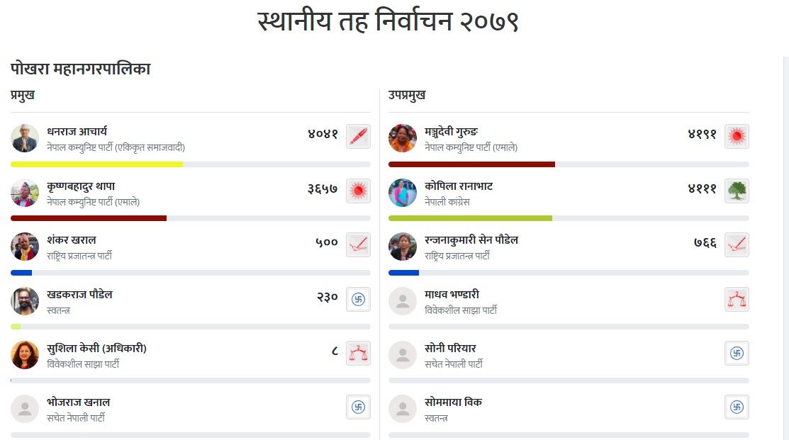पोखरा महानगरपालिकामा नेपाल कम्युनिष्ट पार्टी (एकिकृत समाजवादी) उम्मेदवार धनराज आचार्य ४,०४१ मतका साथ अग्रस्थानमा छन् । आचार्यलाई पछ्याइरहेका नेपाल कम्युनिष्ट पार्टी (एमाले)का कृष्णबहादुर थापाले ३,६५७ मत ल्याएका छन् ।