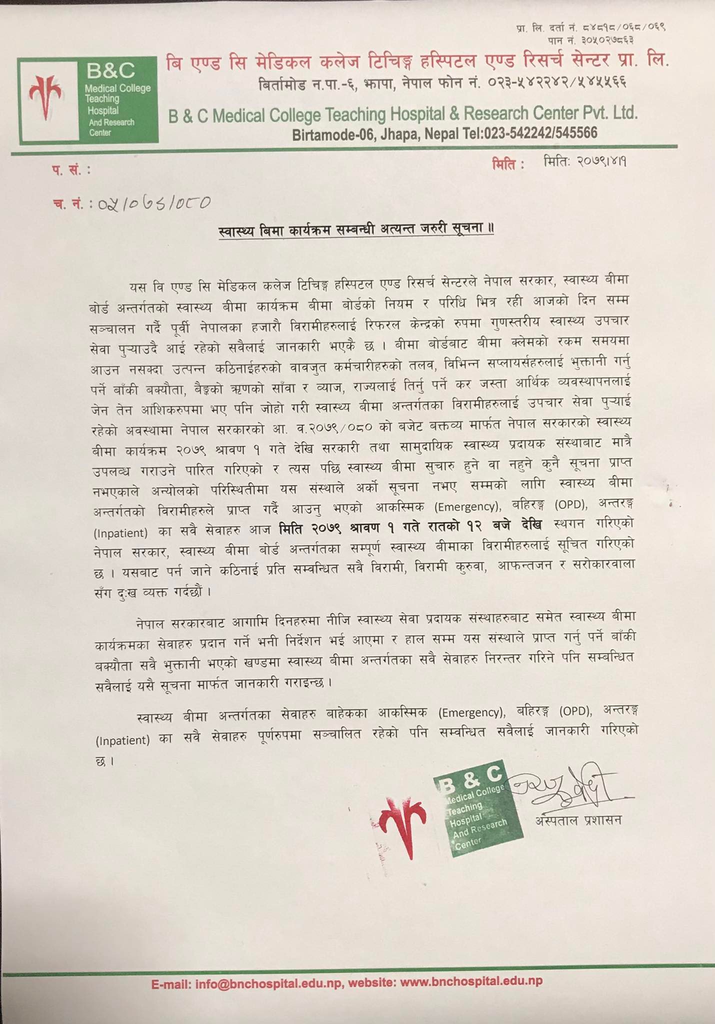 यता, बिएण्डसीका सञ्चालक दुर्गा प्रसाई जनताको उपचार सेवा प्रभावित नगरौं भन्दा भन्दै पनि केही उपाय नलागेपछि स्वास्थ्य बीमा कार्यक्रमको उपचार बन्द गर्नुपर्ने अवस्था बनेको तर्क गर्छन् । निजी क्षेत्रबाट सञ्चालित पूर्वका तीन ठूला अस्पताल, नोबेल, विराट र बिएण्डसीमा दैनिक हजारौं विरामीले स्वास्थ्य बीमा बापत निःशुल्क उपचार गराउँदै आएका थिए । अब, यो सेवा प्रभावित बन्ने भएको हो । स्वास्थ्य बिमा कार्यक्रम बन्द भएपनि शुल्क तिरेर गरिने उपचार सेवा भने सूचारु हुने अस्पतालहरूले जनाएका छन् ।