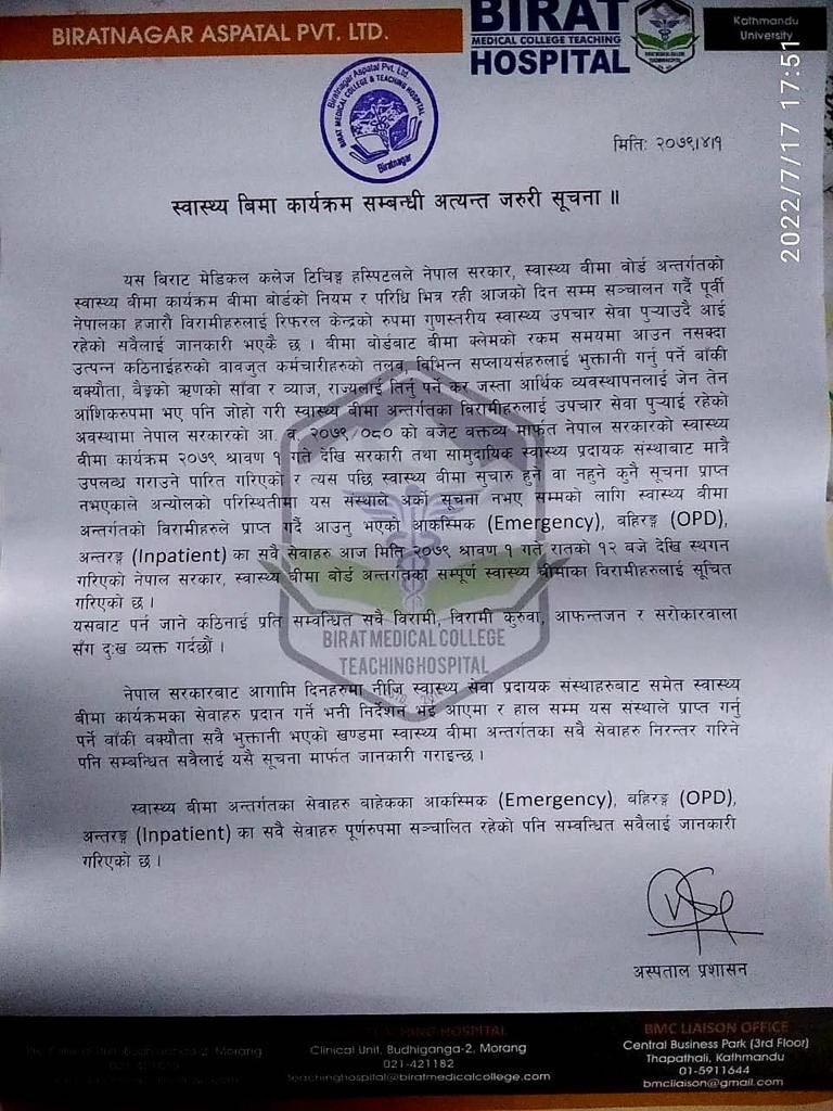 आइतबार राती १२ बजेबाट बीमा मार्फतको उपचार सेवा बन्द गरिने अस्पतालहरूले जनाएका छन् । स्वास्थ्य बीमा कार्यक्रममार्फत बिरामीको निःशुल्क उपचार गरेबापत स्वास्थ्य बीमा बोर्डले यी तीन अस्पताललाई १ अर्ब ४५ करोड रकम भुक्तानी गर्न बाँकी छ । नोबेलको ५५ करोड, विराटको ४६ करोड र बीएण्डसीको ४४ करोड रकम स्वास्थ्य बीमा बोर्डले भुक्तानी गरेको छैन ।
