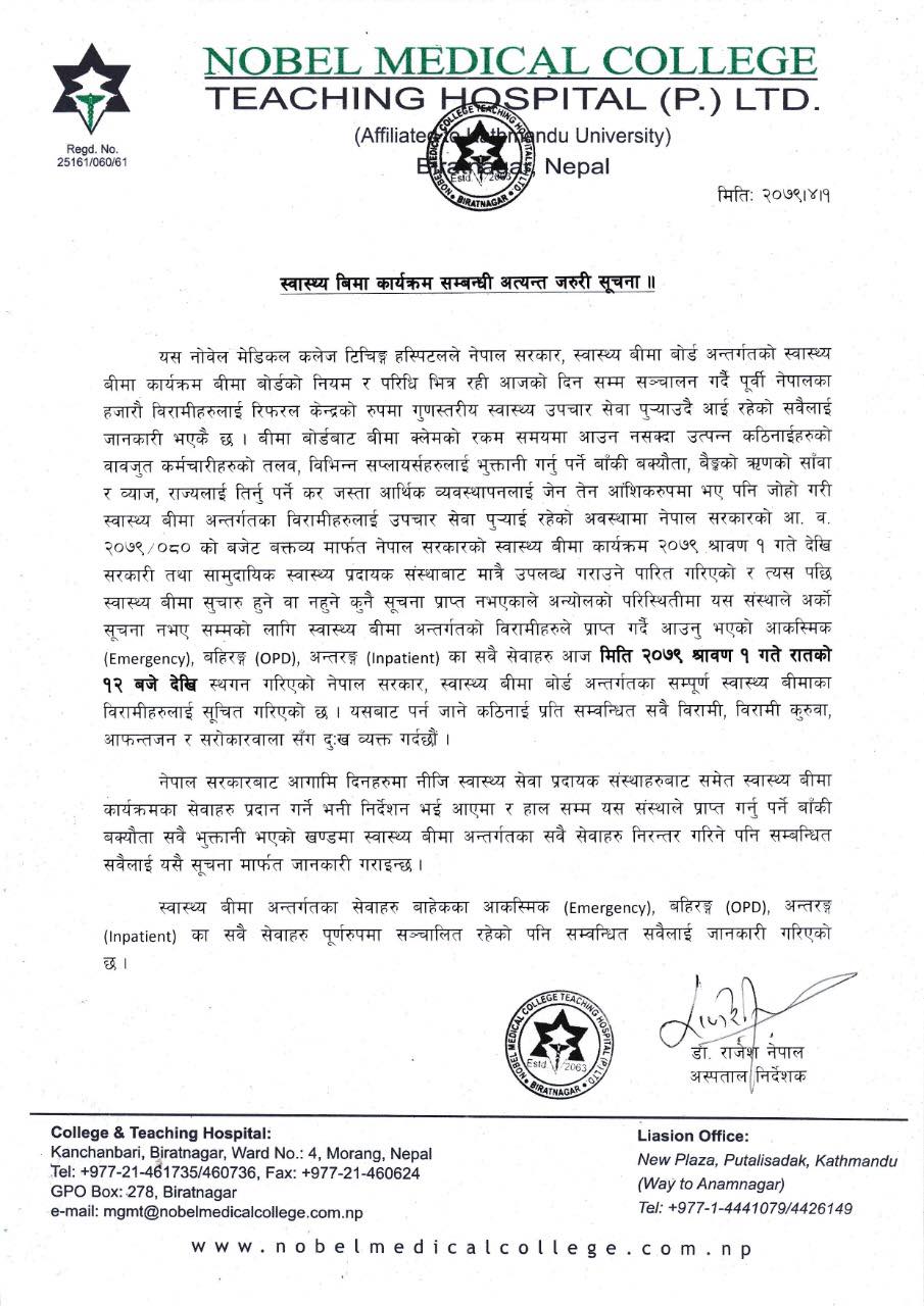 आर्थिक वर्ष २०७९/८० को बजेट वक्तव्यमा २०७९ साउन १ गतेबाट सरकारी तथा सामुदायिक स्वास्थ्य प्रदायक संस्थाबाट मात्रै स्वास्थ्य विमा कार्यक्रम उपलब्ध गराउँने भनिएको थियो । तर, त्यसपछि अस्पतालहरूलाई कुनै आधिकारिक कुरा नआएकाले अब स्वास्थ्य बीमा बापत उपचार गर्दा त्यसको भुक्तानी प्राप्त हुने वा नहुने अन्यौल भएकाले पनि बीमा कार्यक्रम बन्द गर्नु परेको डा.शर्मा बताउँछन् । बाध्य भएर स्वास्थ्य बीमा कार्यक्रम बन्द गर्नु परेको भन्दै नोबेलले आइतबार स्वास्थ्य बीमा बोर्डलाई पनि पत्र पठाएको छ ।