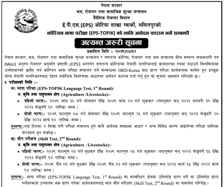 इच्छुक नेपाली नागरिकले भाषा परीक्षाका लागि निवेदन दिन सक्ने इपिएस कोरिया शाखा ग्वार्को ललितपुरले सूचना निकालेर जानकारी गराएको छ। भाषा परीक्षा पहिलो चरणको कृषि तथा पशुपालन क्षेत्रका लागि माघ १६ देखि माघ २७ गतेसम्म हुनेछ। दोस्रो चरण भने फागुन ८ देखि फागुन २६ गतेसम्म भाषा परीक्षा हुनेछ। सीप परीक्षण भने फागुन ३ देखि ५ गतेसम्म र चैत १ देखि ३ गतेसम्म हुनेछ।