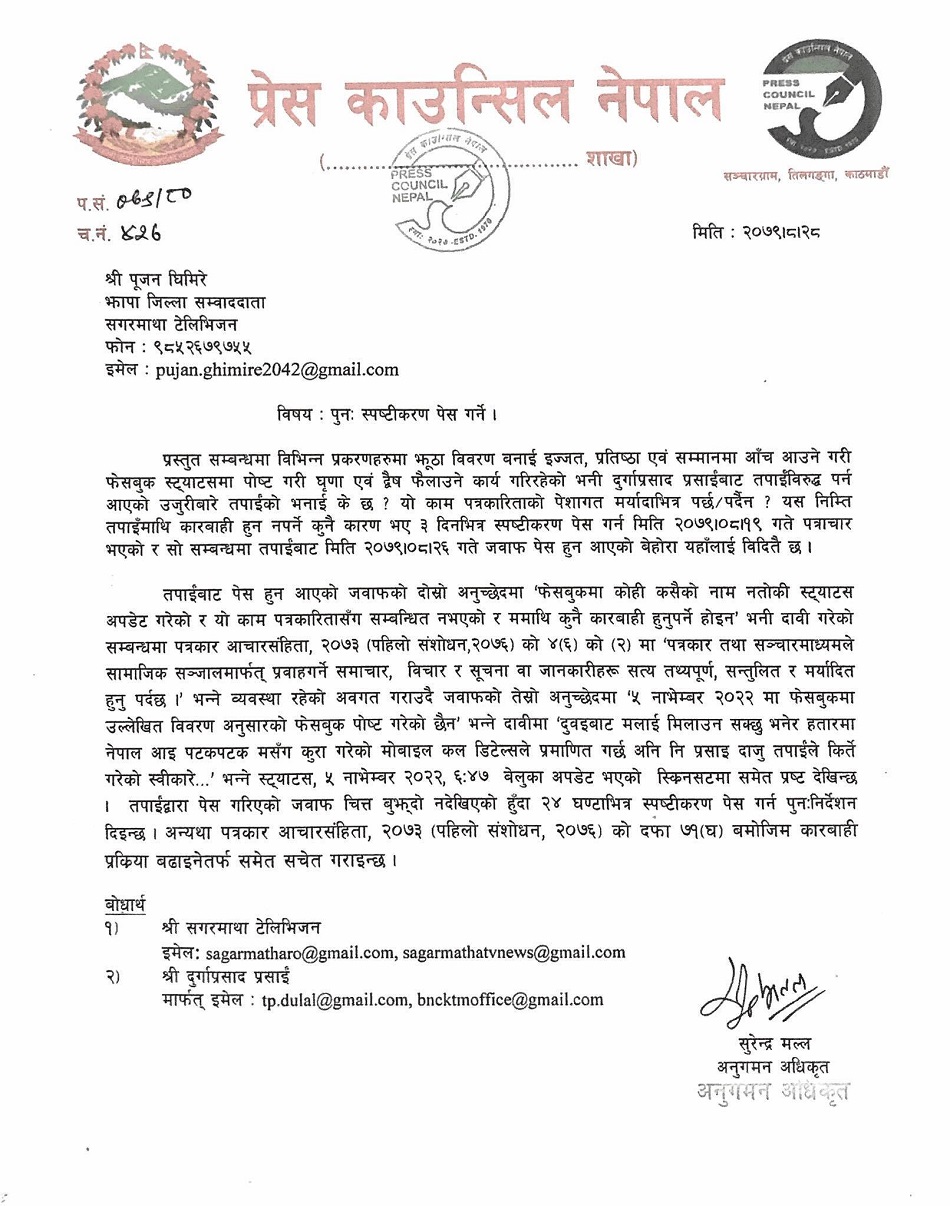काउन्सिलले चित्तबुझ्दो जवाफ पेस नगरे पत्रकार आचारसंहिता, २०७३ (पहिलो संशोधन, २०७६) को दफा ७१ (घ) बमोजिम कारबाही प्रक्रिया बढाइने भन्दै घिमिरेलाई सचेत गराएको छ ।