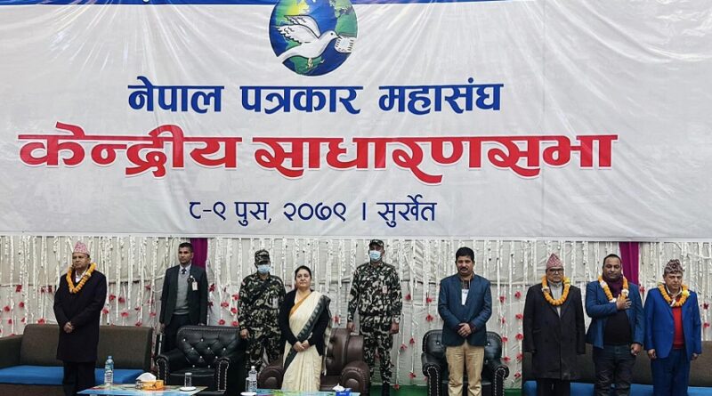 काठमाडौँ, १० पुस – नेपाल पत्रकार महासङ्घको साधारणसभा १५ बुँदे घोषणापत्र जारी गर्दै सम्पन्न भएको छ । कर्णाली प्रदेशको सुर्खेतमा हिजो देखि सुरु भएको साधारणसभा आज समापन भएको हो । साधारणसभाले महासचिव, कोषाध्यक्ष र लेखा समिति संयोजकको प्रतिवेदन पारित गर्दै घोषणा जारी गरिएको महासचिव रोशन पुरीले जानकारी दिनुभयो ।