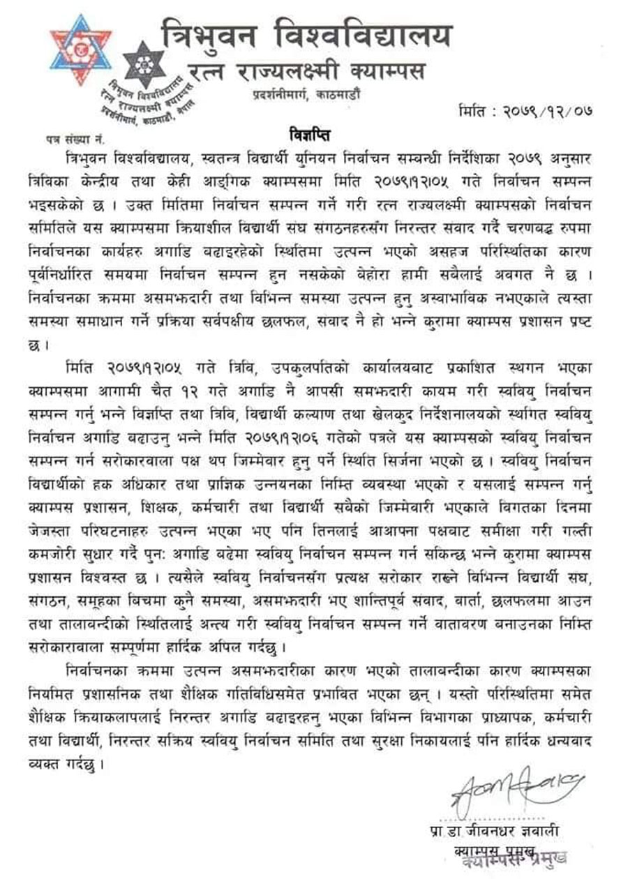 त्रिवि उपकुलपति कार्यालय तथा विद्यार्थी कल्याण तथा खेलकुद निर्देशनालयले स्थगित भएका क्याम्पसहरुको स्ववियु निर्वाचन चैत १२ गते अगाडी आपसी समझदारी कायम गरी निर्वाचन सम्पन्न गराउन विज्ञप्ति तथा पत्राचार भएकोले सबै सरोकारवाला पक्ष जिम्मेवार हुनपर्ने स्थिति देखिएको भन्दै क्याम्पसले ताला खोल्न तथा छलफलमा आउन आग्रह गरेको छ ।