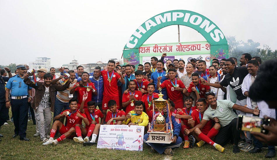 वीरगञ्ज, २६ कात्तिक – नेपाल पुलिस क्लबले वीरगञ्जमा सञ्चालित प्रथम वीरगञ्ज गोल्डकप २०८० को उपाधि उचालेको छ । प्रतियोगिताअन्तर्गत आज सम्पन्न फाइनलमा अर्काे विभागीय टोली त्रिभुवन आर्मी क्लबलाई टाइब्रेकरमा २–० गोलअन्तरले पराजित गर्दै पुलिसले उपाधि हात पारेको हो ।