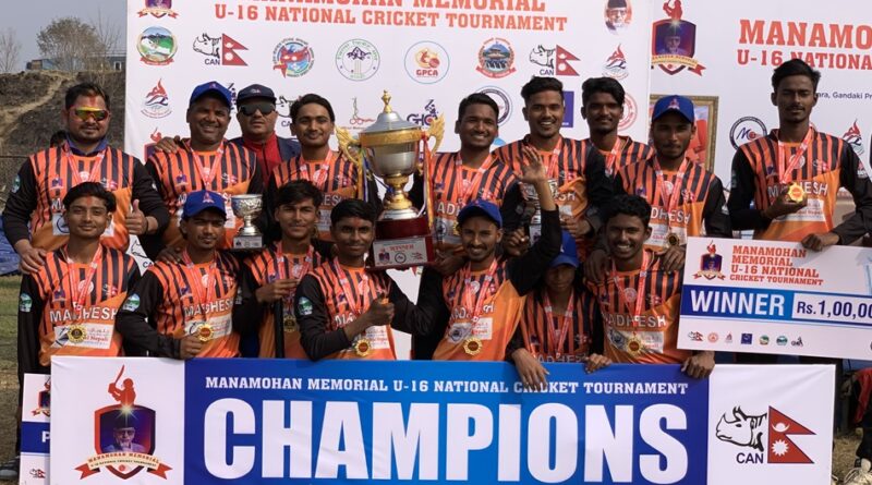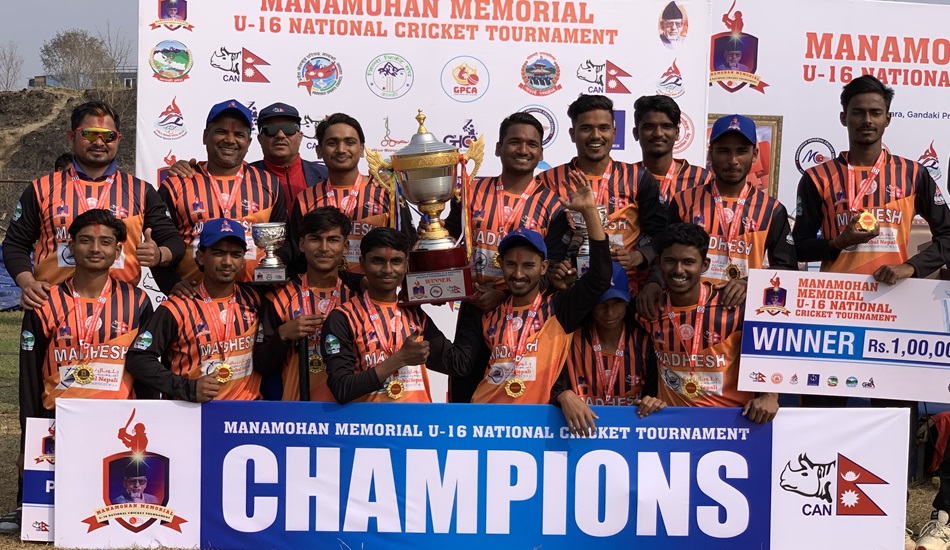 कास्की, ८ फागुन – मधेस प्रदेश दोस्रो पटक मनमोहन मेमोरियल (एमएम) कप राष्ट्रिय यु–१६ क्रिकेट प्रतियोगिताको च्याम्पियन बनेको छ । मनमोहन मेमोरियल क्रिकेट सेन्टरको आयोजनामा पोखरा रङ्गशालास्थित क्रिकेट मैदानमा सञ्चालन भएको तेस्रो संस्करणको प्रतियोगिताको सोमबार सम्पन्न फाइनल प्रतिस्पर्धामा सुदूरपश्चिम प्रदेशमाथि पाँच विकेटको सानदार जित निकाल्दै मधेस दोस्रोपटक च्याम्पियन बन्न सफल भयो ।