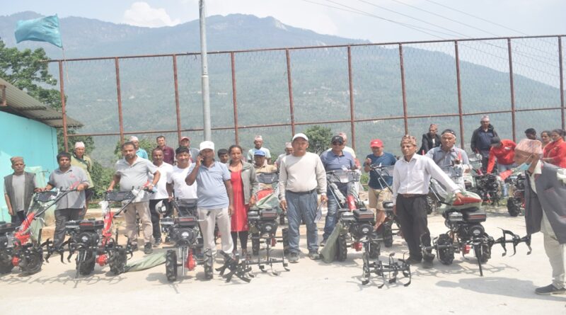 “रु ४० हजार मूल्यका हाते ट्र्याक्टरमा कृषक र गाउँपालिकाले रु २०÷२० हजारको दरले साझेदारी भएको छ, छिट्टै व्यावसायिक रुपमा तरकारी खेती गर्ने कृषकलाई प्लाष्टिक टनेलसमेत अनुदानमा वितरण गर्ने योजना बनाएका छौँ”, वडाध्यक्ष शाहीले भन्नुभयो । शुक्रबार वडा कार्यालयमा आयोजित कार्यक्रममा वडाध्यक्ष शाही, वडा सदस्य जितबहादुर खत्री, आइती दर्जीलगायतले कृषकलाई हाते ट्र्याक्टर वितरण गर्नुभयो ।