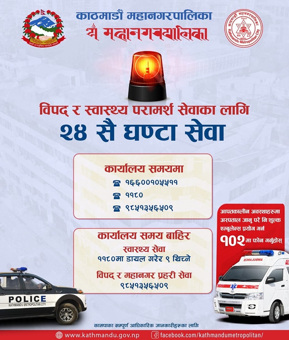काठमाडौँ महानगरपालिकाले विपदजन्य जोखिम र डेंगु हैजासहित महामारी व्यवस्थापनका लागि २४ घण्टे हटलाइन सेवा सुरु