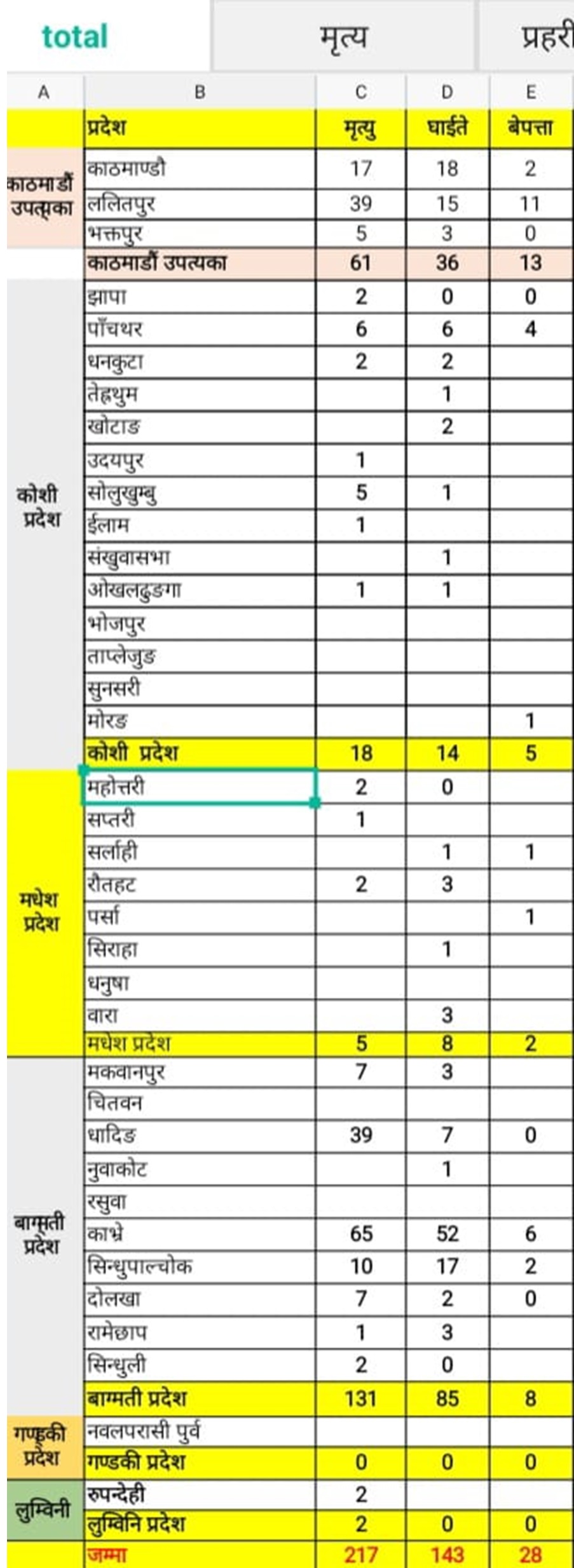 काठमाडौँ, १५ असोज – केही दिनअघिको अविरल वर्षाका कारण भएको बाढीपहिरो र डुबानका कारण हालसम्म दुई सय १७ जनाको मृत्यु भएको छभने २८ जना बेपत्ता छन् ।प्राकृतिक विपद्मा एक सय ४३ जना घाइते भएको गृह मन्त्रालयका प्रवक्ता ऋषिराम तिवारीले जानकारी दिनुभयो ।