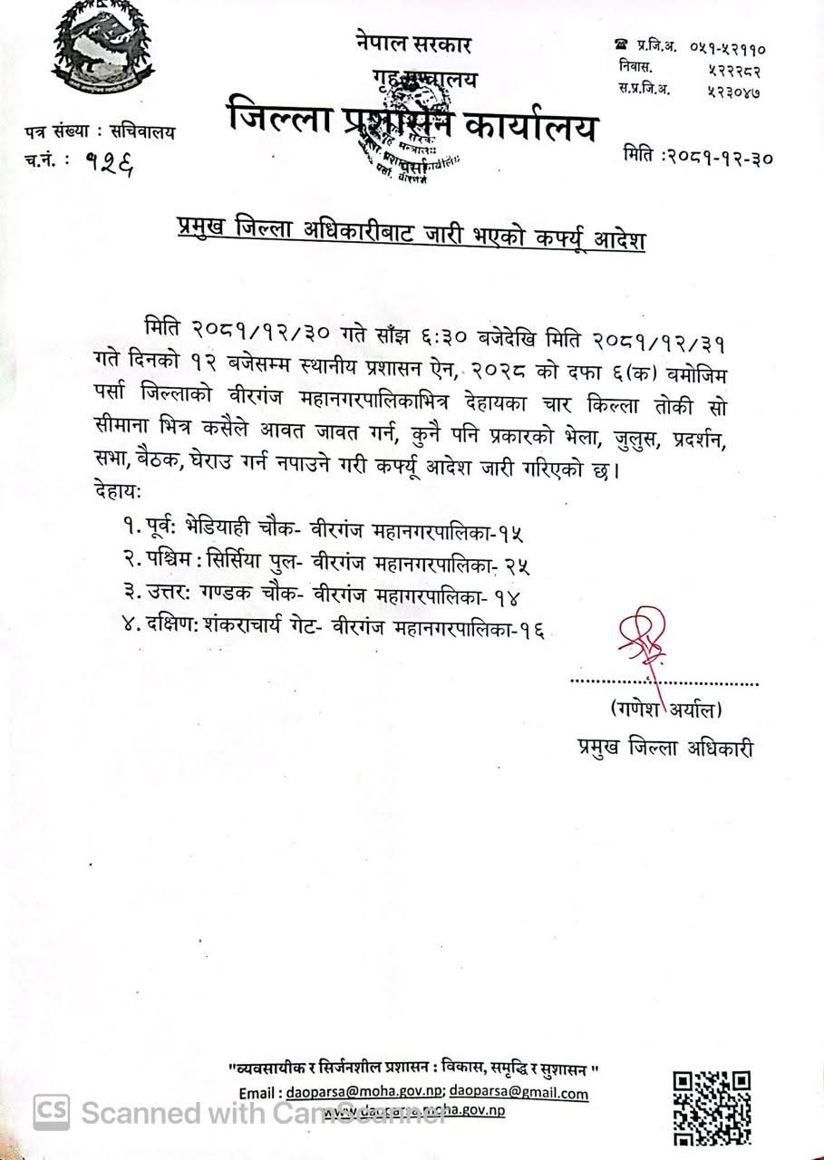 प्रशासनका अनुसार पूर्वतर्फ भेडियाही चौक– वीरगंज महानगरपालिका–१, पश्चिमतर्फ सिर्सिया पुल– वीरगंज महानगरपालिका– २५, उत्तरतर्फ गण्डक चौक– वीरगंज महागरपालिका– १४ र दक्षिणतर्फ शंकराचार्य गेट– वीरगंज महानगरपालिका– १६ मा कर्फ्यु लगाइएको हो ।
