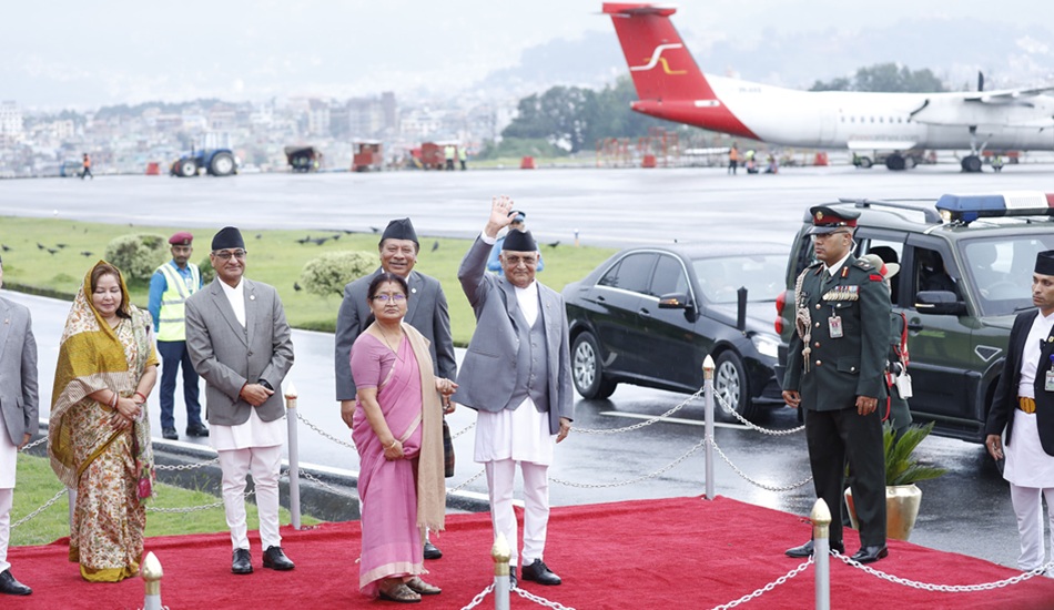 त्रिभुवन अन्तरराष्ट्रिय विमानस्थलको अतिविशिष्ट कक्षमा प्रधानमन्त्री ओलीलाई उपप्रधानमन्त्री एवं सहरी विकासमन्त्री प्रकाशमान सिंह, गृहमन्त्री रमेश लेखक, परराष्ट्रमन्त्री डा आरजु राणा देउवा तथा मुख्यसचिव एकनारायण अर्यालले बिदाइ गर्नुभयो ।