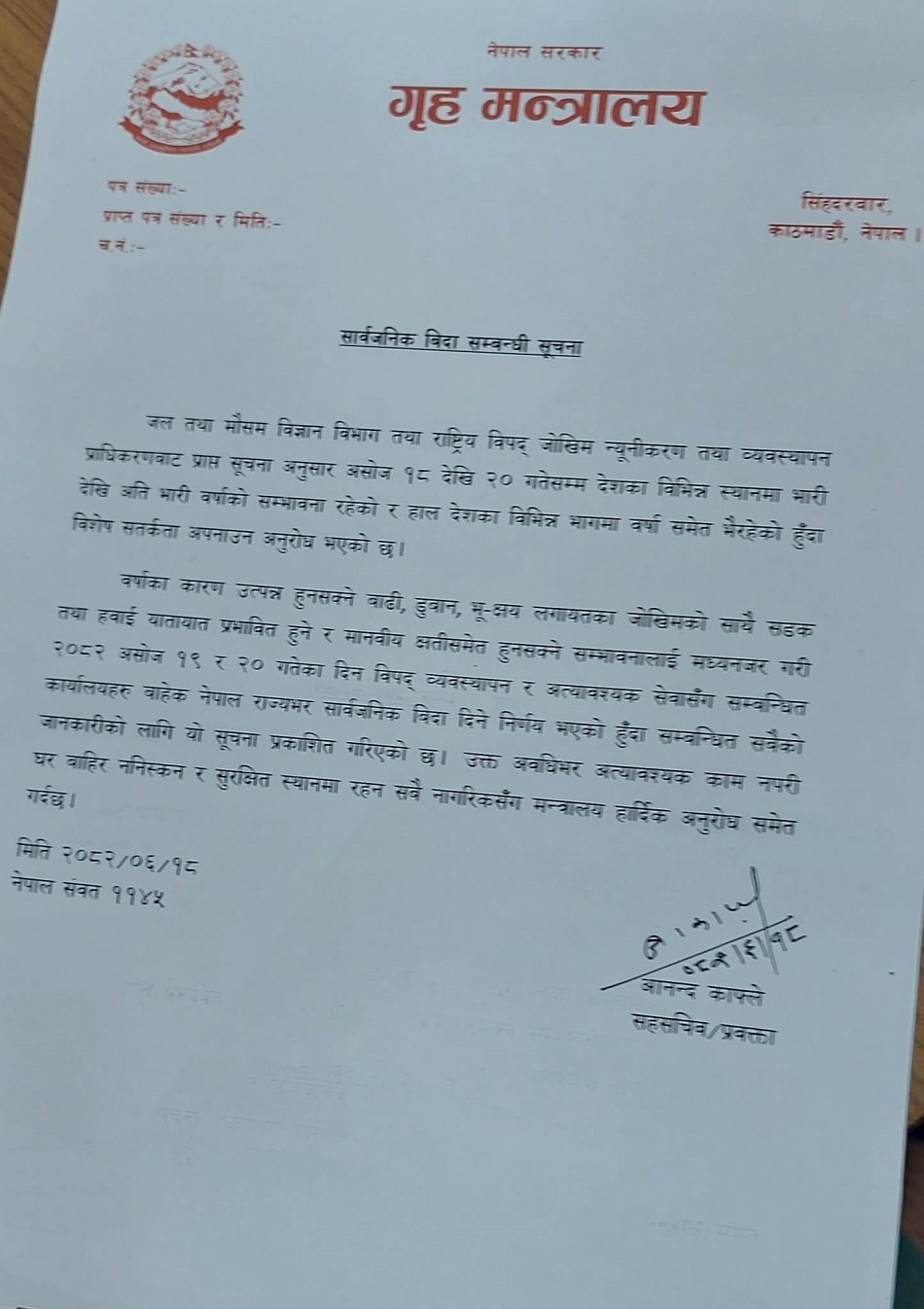 मन्त्रालयले जल तथा मौसम विज्ञान विभाग तथा राष्ट्रिय विपद् जोखिम न्यूनीकरण तथा व्यवस्थापन प्राधिकरणबाट प्राप्त सूचना अनुसार असोज १८ देखि २० गतेसम्म देशका विभिन्न स्थानमा भारीदेखि अतिभारी वर्षाको सम्भावना रहेको जनाउँदै हाल देशका विभिन्न भागमा वर्षासमेत भइरहेको हुँदा विशेष सतर्कता अपनाउन अनुरोध पनि गरेको छ ।